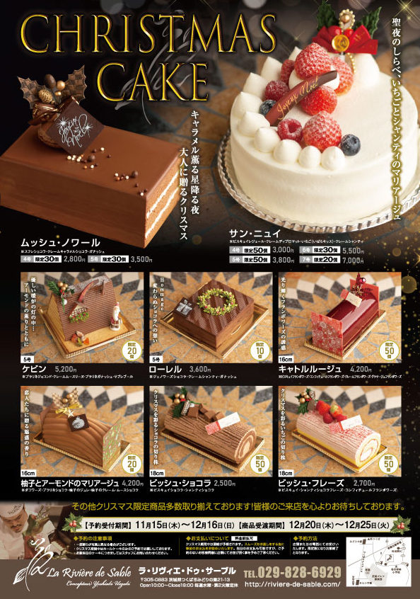 お待たせいたしました! ラ・リヴィエ・ドゥ・サーブルのクリスマスケーキのご案内です! ご予約はお店頭またはお電話にて、11月15日10時~12月16日19時まで受け付けいたします。 数に限りがございますのでお早めにご予約下さい。 皆様ご来店を心よりお待ちしております。 ラ・リヴィエ・ドゥ・サーブル つくば市みどりの東21-13 Tel 029-828-6929 代表 植﨑義明